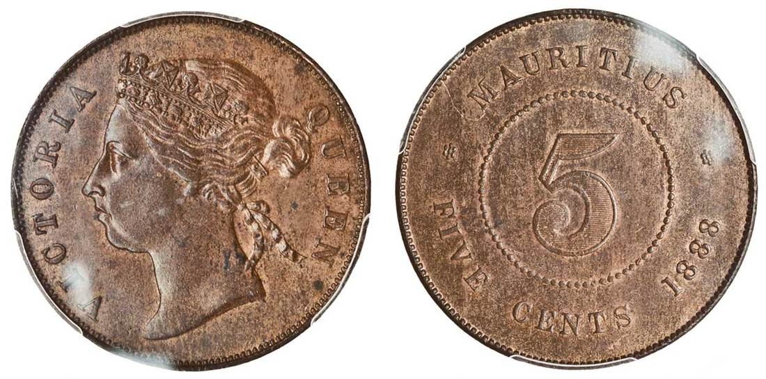 (x) Mauritius, Victoria (1837-1901), Five-Cents, 1888, diademed bust left, rev. mauritius five cents 1888 around figure 5 within beaded circle (KM 9), in a PCGS MS-63BN slab, good extremely fine