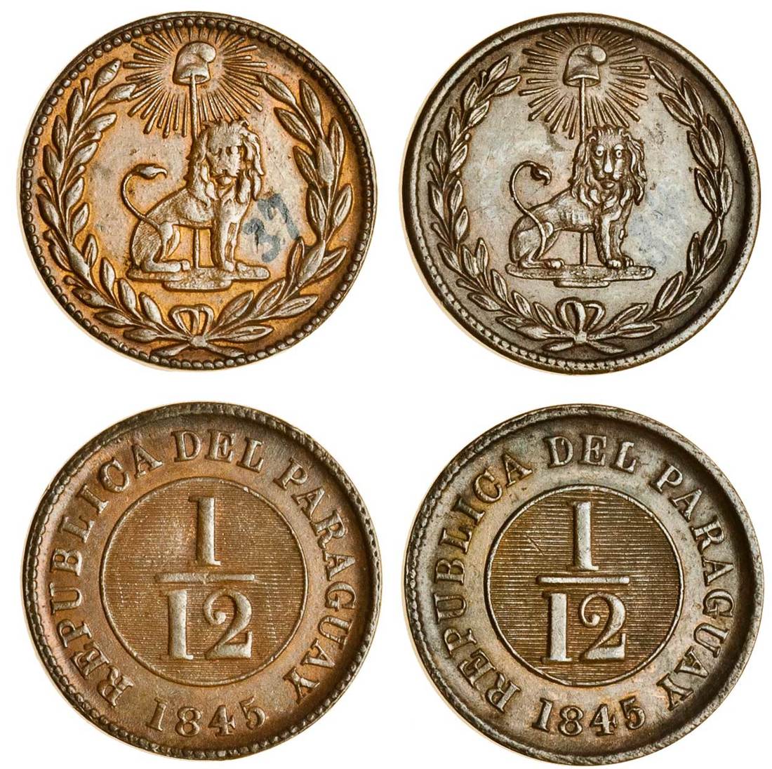 Paraguay, 1/12-Real, 1845 (2), value, rev. lion, the two varieties, one with normal and the other with inverted die axis (KM 1.1), good very fine, the first with some lustre, both with old collection numbers on reverse (2)
