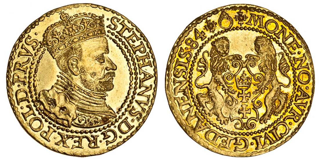 Poland, Stephan Bathory (1576-86), Ducat, 3.54g, 1584, Gdansk (Danzig), stephanvs. d: g. rex. pol. d. prvs., crowned and cuirassed bust right, in double beaded circle, rev. + mone. no.avr. civi. gedanensis. 84 + (ring), city shield with supporters (F.3; HCz.723 - R2), small metal flaw on cheek, extremely fine with attractive bright golden lustre