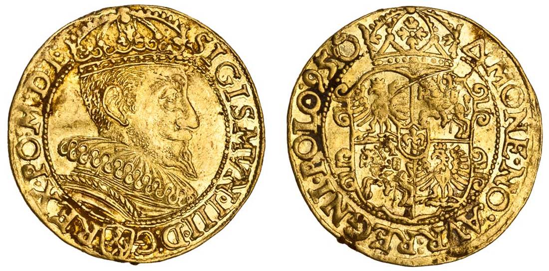 Poland, Sigismund III Vasa (1587-1632), Ducat, 3.50g, 1595, Marienburg mint, .sigismvn. iii. d:g. (shield) .rex. po; m;d;l;, crowned and cuirassed bust right, rev. Δ.mone. no. avr. regni. polo. 95. (ring), crowned shield (F.55; HCz.5033 - R5), wavy flan, small remains of old deposit both sides, small nick on reverse edge at 7 o'clock and a slight scratch on shield, very fine, rare