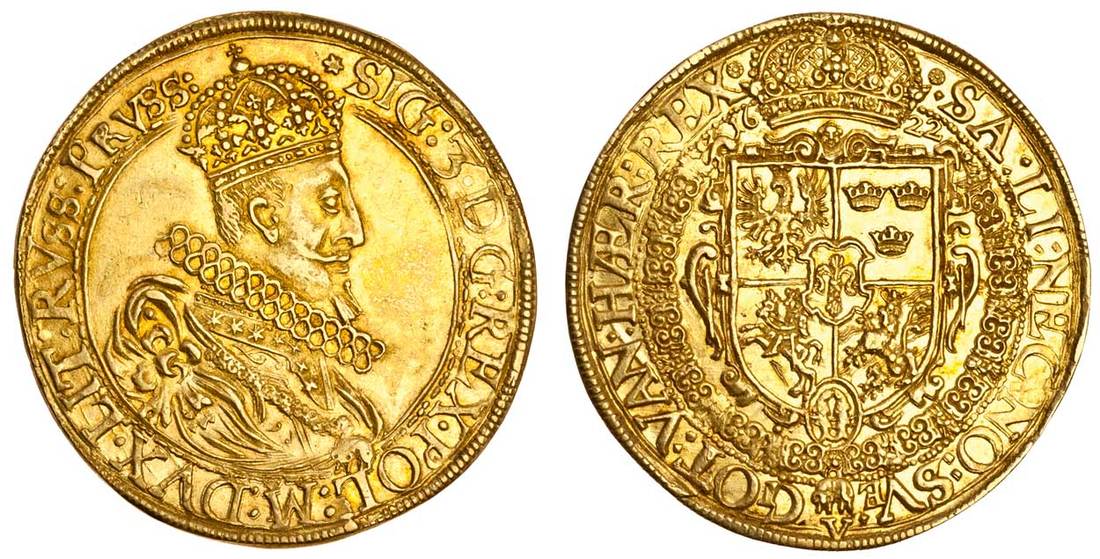 Lithuania, under Poland, Sigismund III Vasa (1587-1632), 5-Ducats, 17.28g, 1622, sig: 3 d g: rex. pol: m: dvx. lit: rvss: prvss:, crowned and cuirassed bust right, wearing wide lace ruff and with lion skin tied over shoulder, rev. .sa: li: nec: no: sve - got: van: haer: rex, crowned shield of Poland, Lithuania, Sweden and the Folkung Lion of the House of Bjelbo (as hereditary King of the Swedes, Goths and Wends), within Collar of the Golden Fleece, crown dividing date above, V (mark of value) below (F.6; KM 27; HCz.1431 - R5), small edge split at 5 o'clock, very lightly scratched in front of face, small scratch on Lithuanian quarter on reverse, nearly extremely fine, an attractive example of this impressive and rare coin