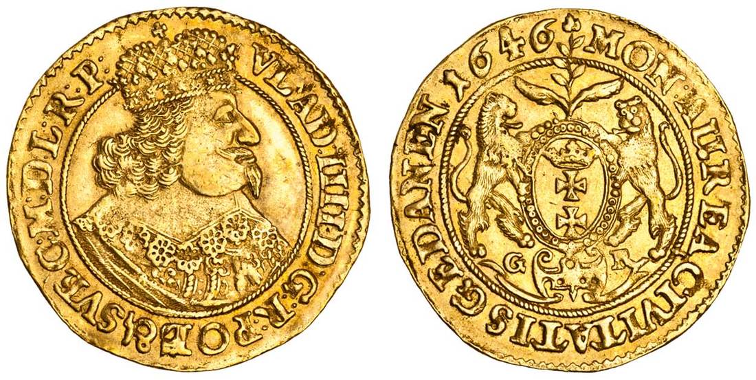 Poland, Wladislaw IV Vasa (1632-48), Ducat, 3.46g, 1646, Gdansk (Danzig), vlad: iiii d: g: r: pol: & svec: m: d: l. r: p:, crowned bust right, wearing falling lace collar, rev. mon: avrea. civitatis gedanen 1646, city shield with supporters, dividing g-r for Gerhard Rogge below (F.15; 9737 - R4), good very fine
