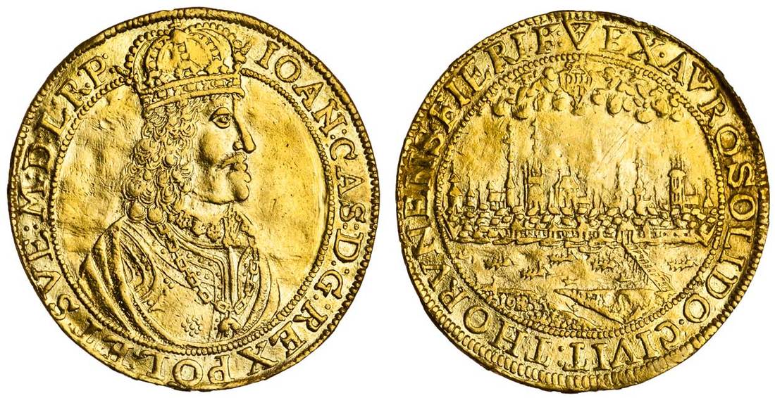 Poland, John II Casimir (1648-68), 4-Ducat, 1655, 13.39g, Thorn, ioan: cas:d:g: rex pol: et sve: m:d:l:r:p:, crowned , cuirassed and draped bust right, wearing Collar and Badge of the Order of the Golden Fleece, rev. initial mark star in triangle, ex. avro. solido. civit. thornens. fieri. f:, view of the city of Thorn across the river Vistula, angels with shield in clouds above, 16-hl-55 in field at low left (for mint master Hans Lippe) (F.62; cf. H.Cz.2050 for a piece of 3-Ducats), edge damaged from a mount and reverse legends re-engraved at 3 and 9 o'clock where mount removed, fine, very rare