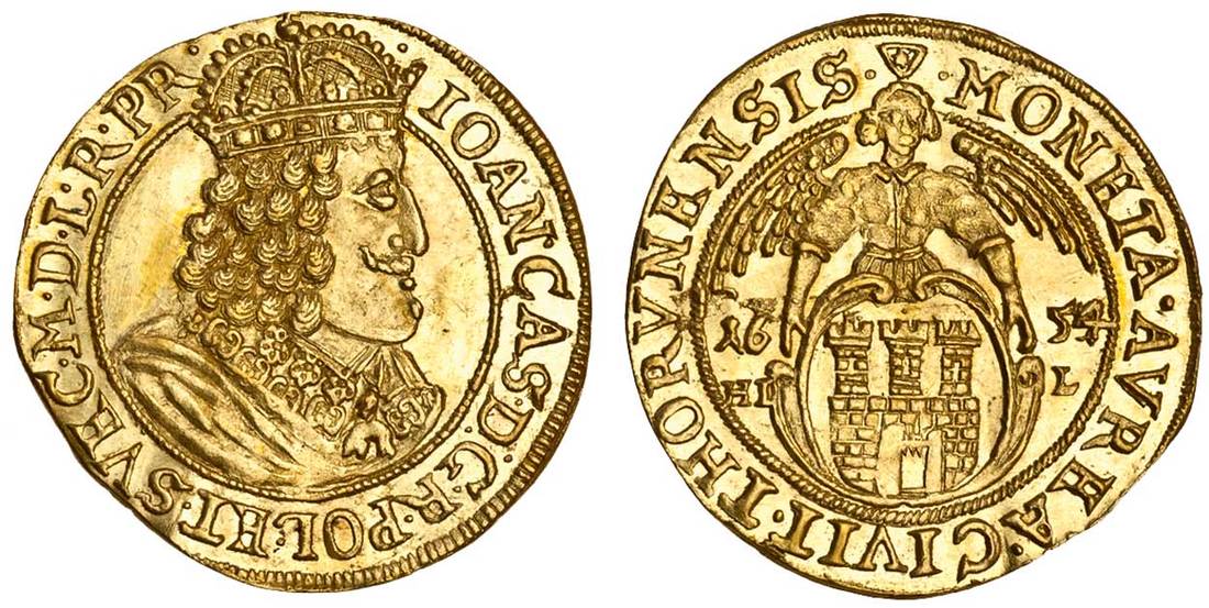 Poland, John II Casimir (1648-68), Ducat, 3.47g, 1654, Thornioan cas. d: g. r.pol. et. svec. m. d. l. r. pr., large crowned and draped bust right, rev. moneta. avrea. civit. thorvnensis., angel holding city shield dividing date and hd-l (F.60; HCz.5889 - R5), field smoothed behind bust, extremely fine and lustrous, rare