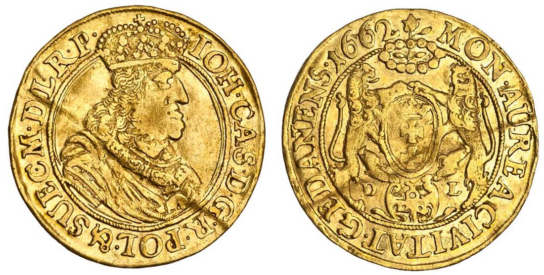 Poland, John II Casimir (1648-68), Ducat, 3.46g, 1662, Gdansk (Danzig), ioh. cas. d. g. r. pol. & suec. m. d. l. r. p., crowned and cuirassed bust right, rev. mon. aurea civitat. gedanensis. 1662, city arms with supporters, floral wreath above, cartouche dividing d-l (F.24; HCz.-; Ch.864), creased and straightened, fine