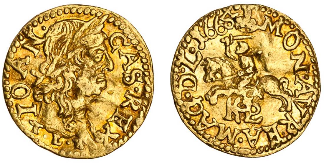 Lithuania, John II Casimir (1648-68), Half-Ducat, 1.70g, 1665, Vilnius, ioan. cas. rex., laureate head right, tlb, for mintmaster Titus Livius Boratyni below, rev. mon. avrea. mag. d. l. 1665, horseman, holding sword and shield (Pogon), galloping left, monogram of hkpl, for the Lithuanian Treasurer Hieronimus Kryszpin Kirszenstein Litewski, below (F.10; HCz.5926 - R2), creased, about very fine