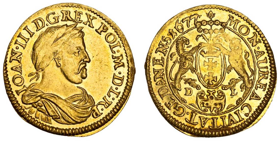 Poland, John III Sobieski (1674-96), Ducat, 3.50g, 1677, Gdansk (Danzig), ioan. iii d. g rex pol. m. d. l. r. p, laureate, draped and cuirassed bust right, rev. mon. aurea civitat. gedanens. 1677, city shield with supporters, wreath of flowers above, cartouche dividing d-l below (F.36; HCz.2437 - R2), weak strike on laurel wreath and corresponding area on reverse, otherwise extremely fine with lustre