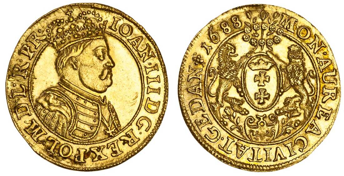Poland, John III Sobieski (1674-96), Ducat, 3.52g, 1688, Gdansk (Danzig), ioan. iii d g. rex pol. m. d. l. r. pr., crowned and cuirassed bust right, rev. mon. aurea civitat. gedan* 1688, city shield with supporters (F.36; HCz.2503 - R2), extremely fine