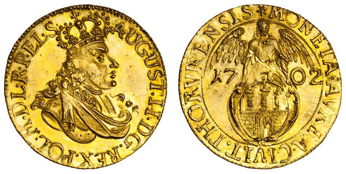 Poland, Augustus II (1697-1733), Ducat, 4.49g, 1702, Thorn, august. ii. dg. rex. pol. m.dl.r.p.el.s., crowned and draped bust right, rev. moneta. avrea. civit. thorvnensis., angle above city shield dividing date, a slightly heavy later striking (F.67; H.Cz.2626), scratch on reverse otherwise extremely fine, rare