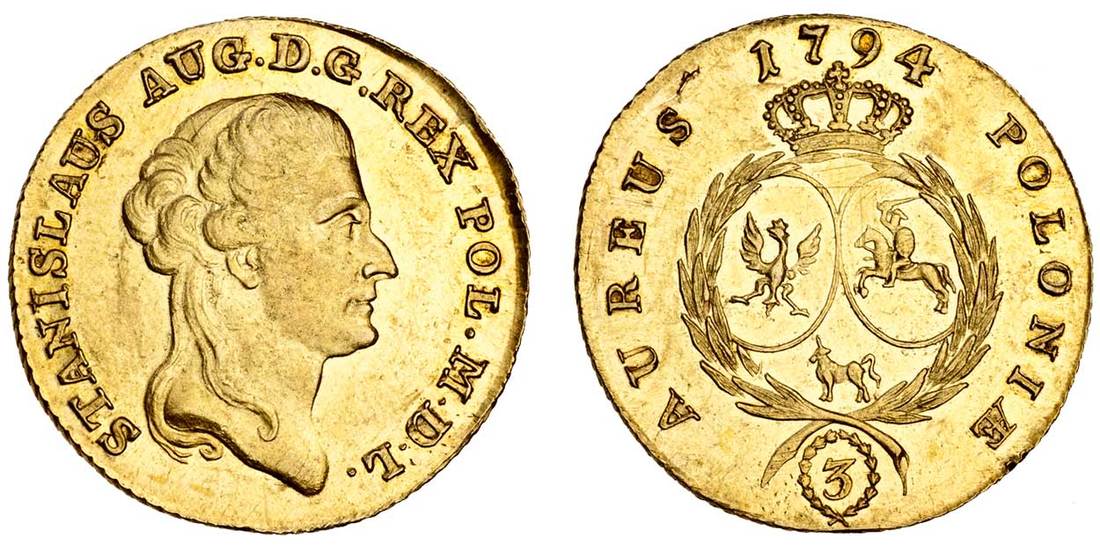 Poland, Stanislas August (1764-95), 3-Ducats, 12.33g, 1794, head left, rev. crowned shields in wreath, value below (F.98; HCz.3365 - R2), extremely fine
