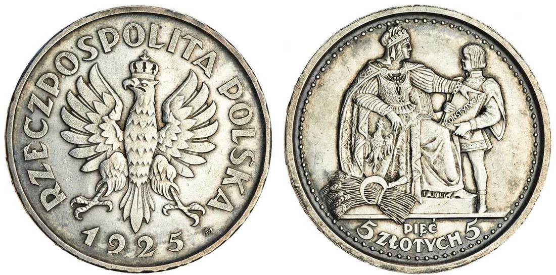 Poland, Republic, 5-Zlotych, 1925, Adoption of the Constitution, crowned eagle with wings open, monogram by date, rev. Polonia enthroned, 81 pearls in circle, lettered edge (KM 17.3), extremely fine