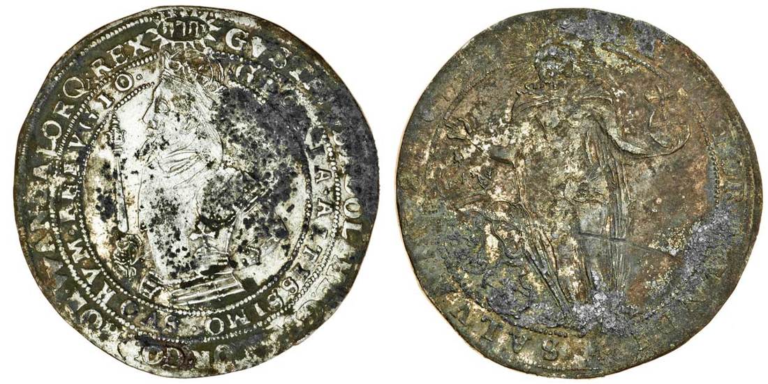 Sweden, Gustav II Adolphus (1611-32), Riksdaler, 1617, Stockholm, King half-length left, legend ends wandalor, rev. Christ standing (Dav.4516; KM 82), excavated, uncleaned, lightly scraped when unearthed but apparantly an uncirculated coin with lustre visible under the verdegris and other deposit