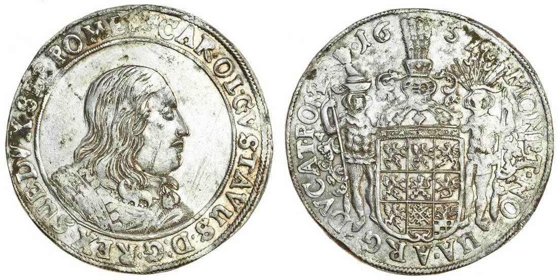 Sweden, Pommerania (Pomern), Charles X Gustav (1654-60), Taler, 1657, Stettin, bust right, rev. shield with helm and supporters (Ahlström 37; Dav.4577), cleaned, good very fine, rare