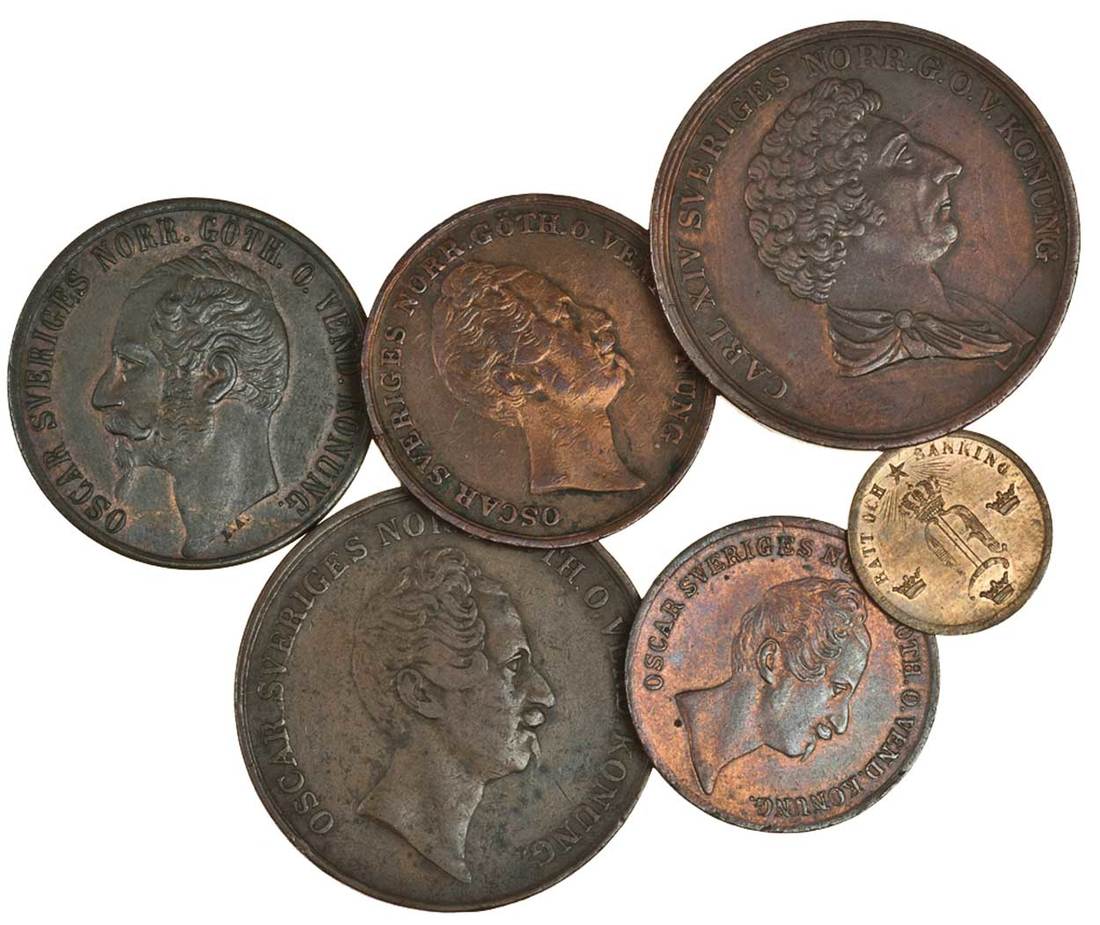 Sweden, AE 2-Skilling (2), 1836, 1849, Skilling, 1847, 2/3-Skilling, 1855, 5-Öre, 1857, ½-Öre, 1857 (KM.643, 663, 664, 671, 686, 690), the first three coins about very fine to good very fine, the others extremely fine (6)