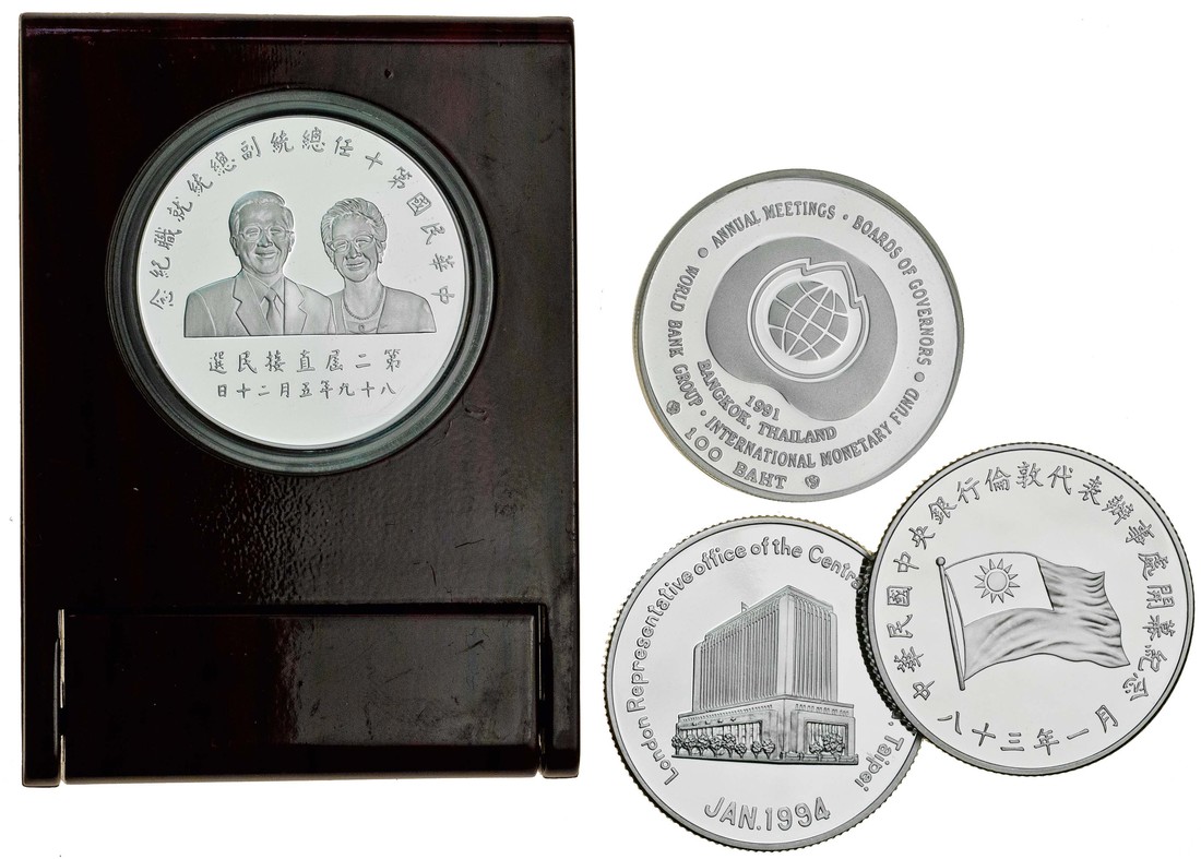 China, Republic, silver medal, in Commemoration of the Grand Opening of London Representative Office of the Central Bank of China, Taipei, 1994, and Commemorative silver coin for the inauguration of the Tenth President and Vice President of the Republic of China, 2000, with Thailand, proof copper nickel 100-Baht, 1991, all brilliant uncirculated, in cases of issue (3)