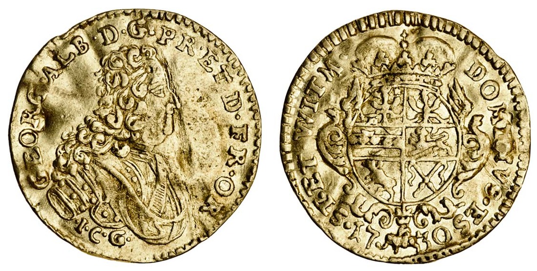 Germany, Ostfriesland (East Frisia), Georg Albrecht (1708-34), Ducat, 3.37g, 1730 i.c.g. bust of Georg Albrecht right, rev. crowned arms (F.894; KM. 157; Knyph.6589), from a mount, flan slightly wavy, good fine, rare