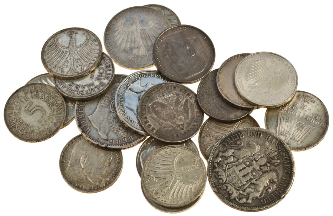 Germany, silver coins (20), Anhalt, 3-Mark, 1914, Baden, Gulden, 1852, Hamburg, 5-Mark, 1876, Prussia, 2-Mark, 1901, Wuerttemberg, 5-Mark, 1903F, 5-Reichsmark (4), Potsdam 1935A, Hindenberg 1935A, 1937F, 1939J, 10-Deutsche-Mark, 1972F, and 5-Deutsche-Mark (10), 1951D, 1951F (2), 1956J, 1957J, 1961D, 1971D, 1972J, 1974D, and 1977J, fine or better (20)