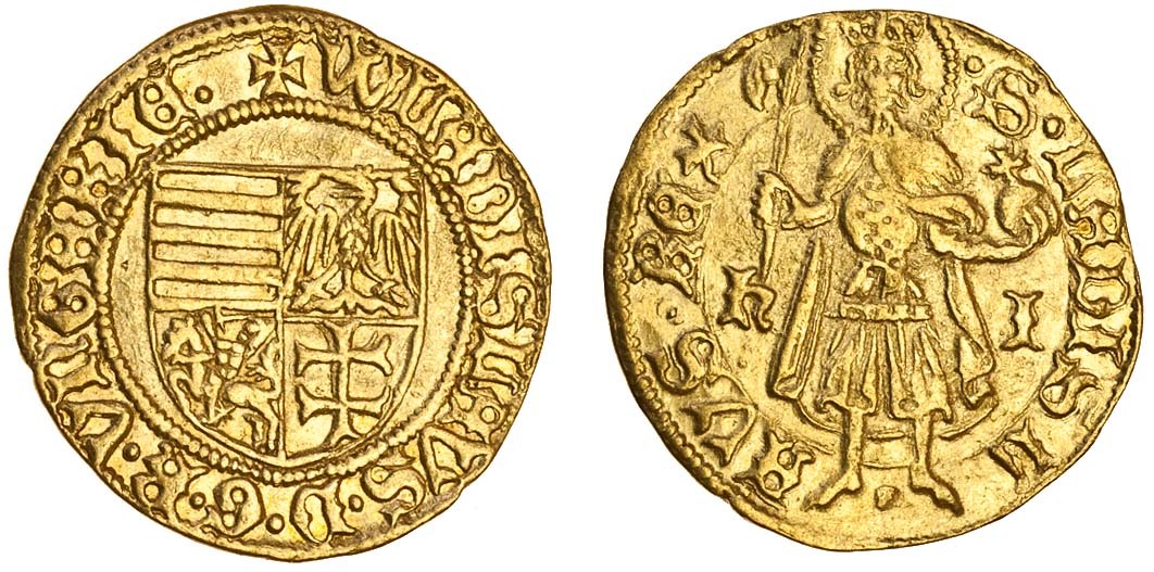 Hungary, Wladislaus I (1440-44), Goldgulden, 3.48g, Hermannstadt, + wladislavs • d • g • r • vngarie, quartered arms of Hungary-Bohemia-Moravia-Austria, rev. s • ladisl-avs • rex, Saint standing facing holding axe and orb, dividing h-i (F. 8; Phol F1-3), very fine