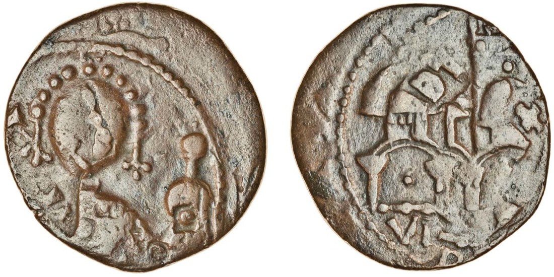 MEC notes 'This is the most famous of Guiscard's follari, showing him crowned as a byzantine emperor, the model for the obverse being probably, as Grierson suggested, a histamenon of Nicephorus III. Grierson believed it to have been struck at the time of Guiscard's capture of Slaerno, but while it obviously celebrates this event, the evidence of overstrikes shows that it is not his earliest type and must be a little later in date.'