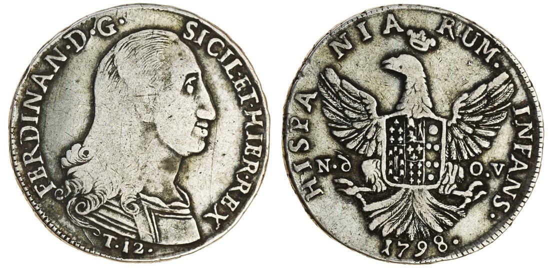 Italy, Sicily, Ferdinand III (1759-1816), 12-Tari, 1798 n.d-o.v, ferdinan., bust right, rev. hispa nia rum. infans., shield on eagle (MIR 603/3; Mont.260 var.), fine