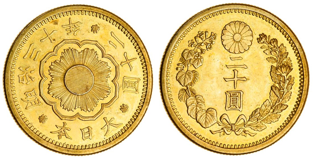 Japan, Mutsuhito (1867-1912), 20-Yen, year 30, sun, rev. value in wreath (KM Y34), about extremely fine