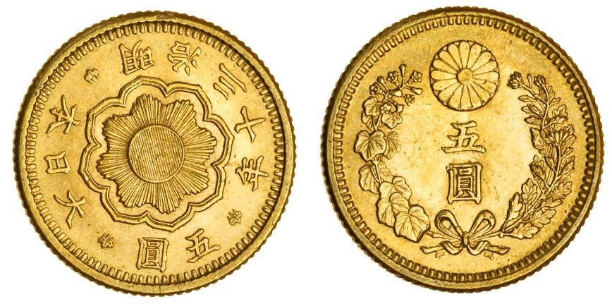 Japan, Mutsuhito (1867-1912), 5-Yen, year 30 (1897), sun, rev. value in wreath (KM Y32), good very fine