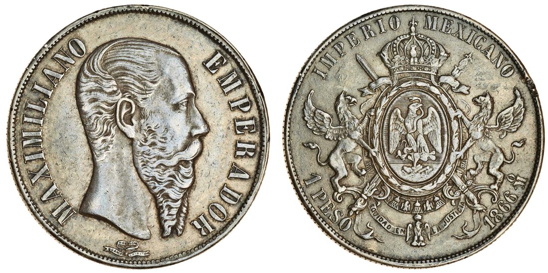 Mexico, Maximilian (1864-67), Peso, 1866, head right, rev. arms (KM 388), very fine