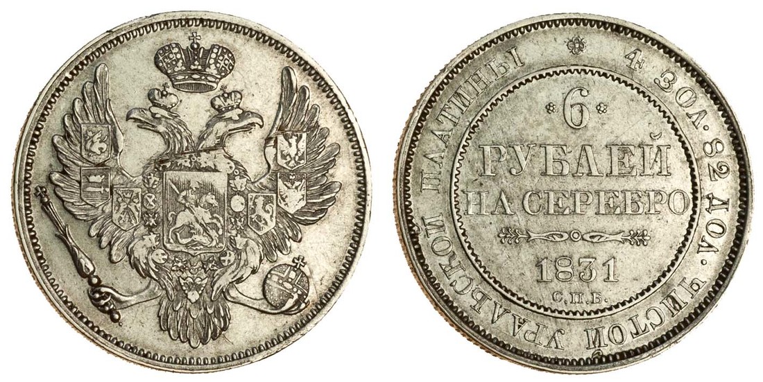 Russia, Nicholas I (1825-55), platinum 6-Roubles, 1831, St Petersburg, crowned double eagle with shield of St George and Collar of the Order of St Andrew on breast, rev. value and date (Bitkin 57; KM C178; Sev.603), slightly weakly struck in centre, otherwise very fine, rare