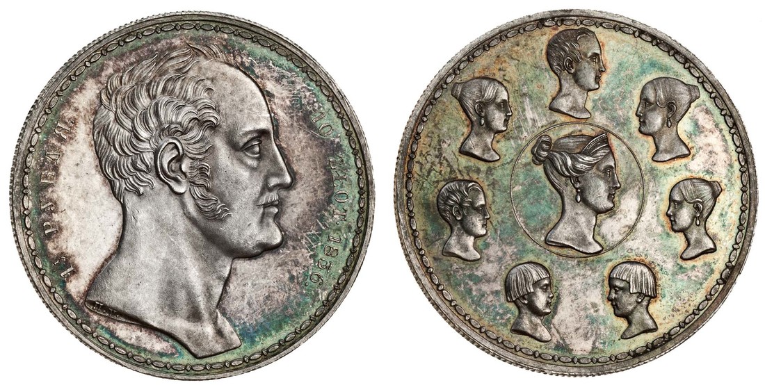 Russia, Nicholas I (1825-55), 'Family' Rouble (1 1/2 Rouble), 1836, by P. Utkin, head right, signed with initials on truncation, rev. head of the Empress Alexandra surrounded by heads of her seven children (KM C172; Sev.3181; Uzd.4207), a light scratch in front of head and on forehead, otherwise beautifully toned and proof-like, good extremely fine, a crisp early strike with no evidence of die breaks, a great rarity, one of only fifty pieces struck