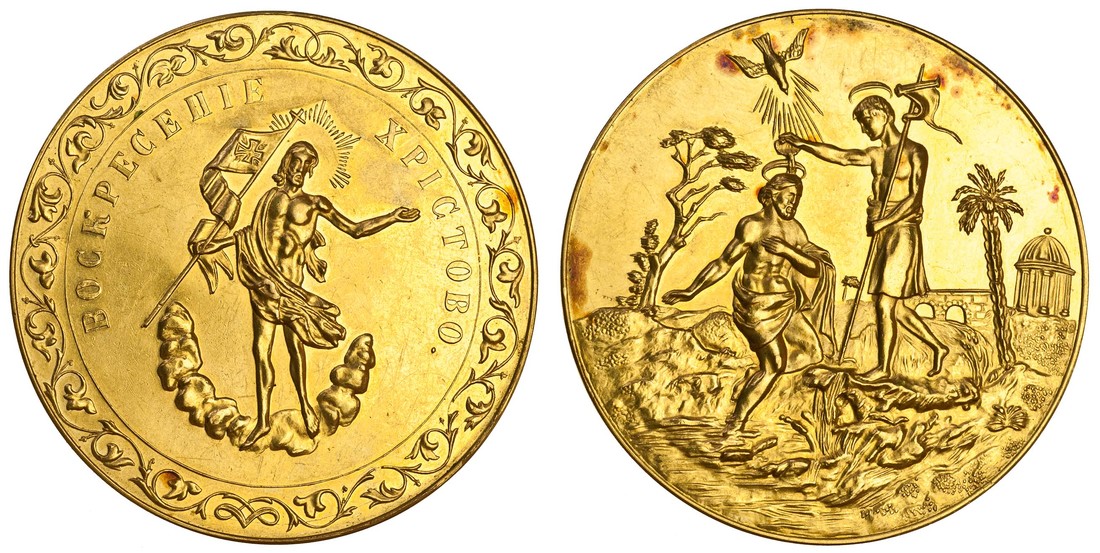 Russia, anonymous, Easter gold medal, 29.46g, undated (19th century), Christ resurrected, rev. scene of John the Baptist baptising Christ, about uncirculated
