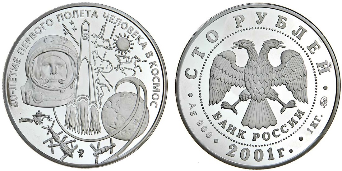 Russia, Russian Federation silver proof 100-Roubles (one kilo), 2001, struck to mark the 40th anniversary of Yuri Gagarin's space flight (KM Y681), brilliant uncirculated, in case of issue, 750 minted