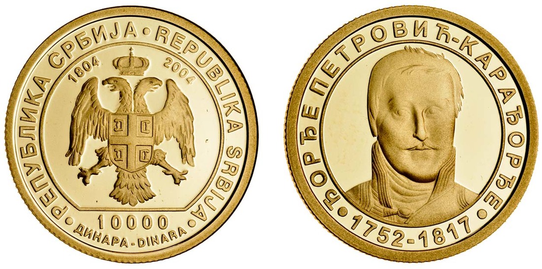 Serbia, proof gold 10,000-Dinars, 2004, arms, rev. bust of Tesia, struck to mark the 200th Anniversary of the First Serbian Uprising (KM 45), brilliant uncirculated, in case of issue with certificate