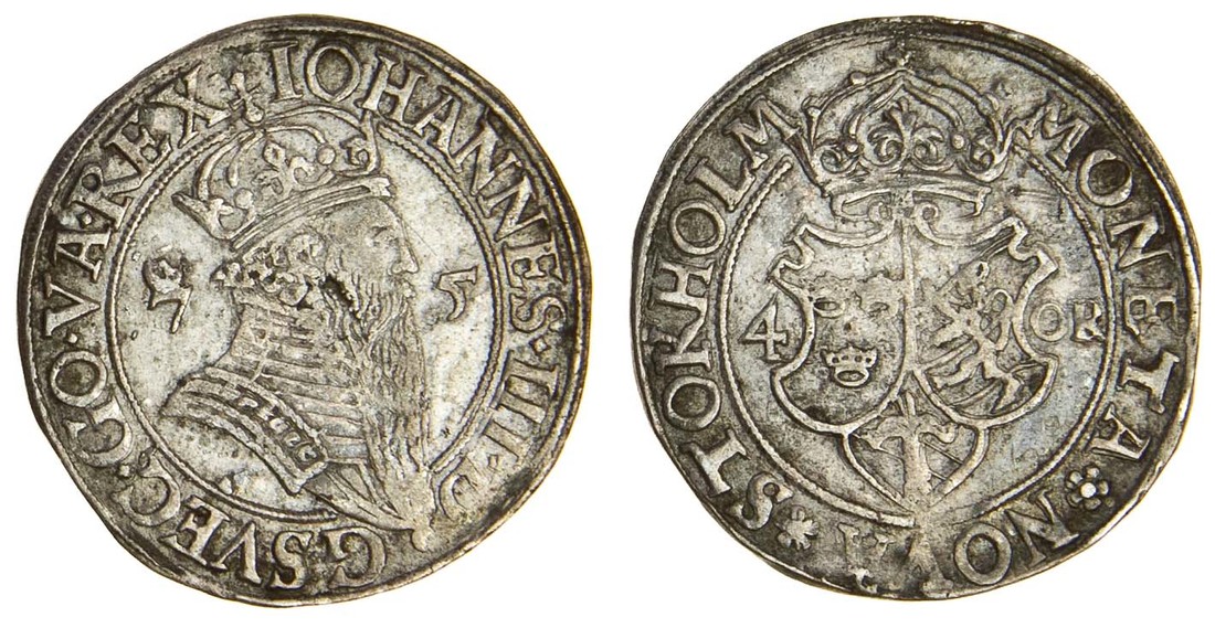 Sweden, Johan III (1568-1592), 4- Öre 1575, Stockholm, crowned bust of king right, rev. crowned tripartite crest (SM.55), about very fine, scarce