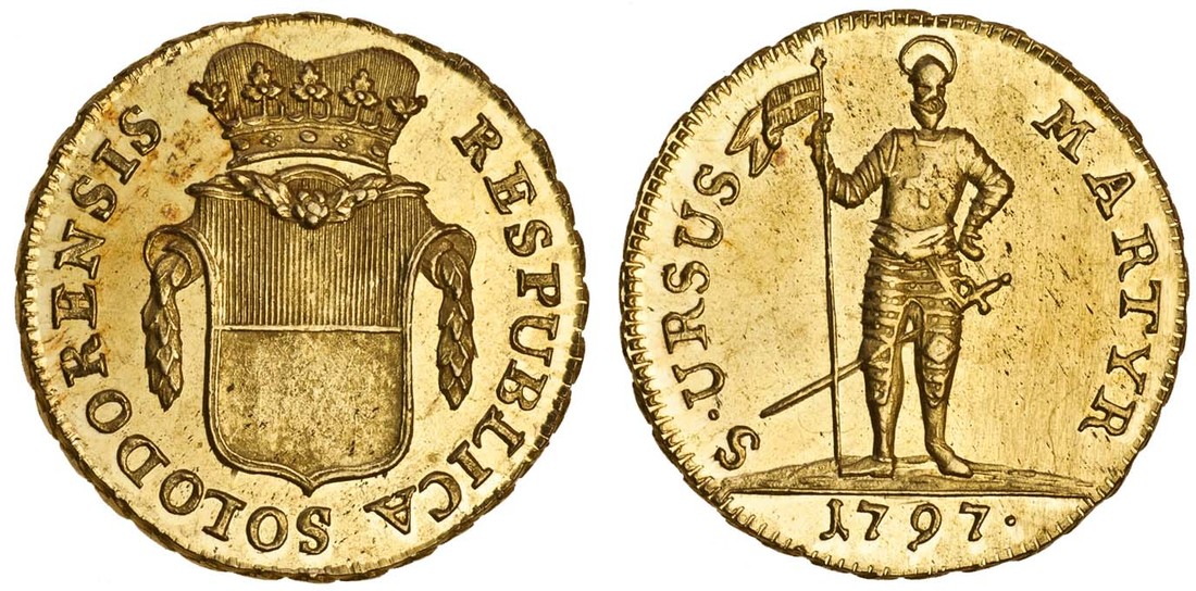 Switzerland, Solothurn, 2-Duplone, 1797, crowned shield, rev. St Ursus standing holding banner (DT 670d; F.390; HMZ 2-839c; KM 61), lustrous, extremely fine