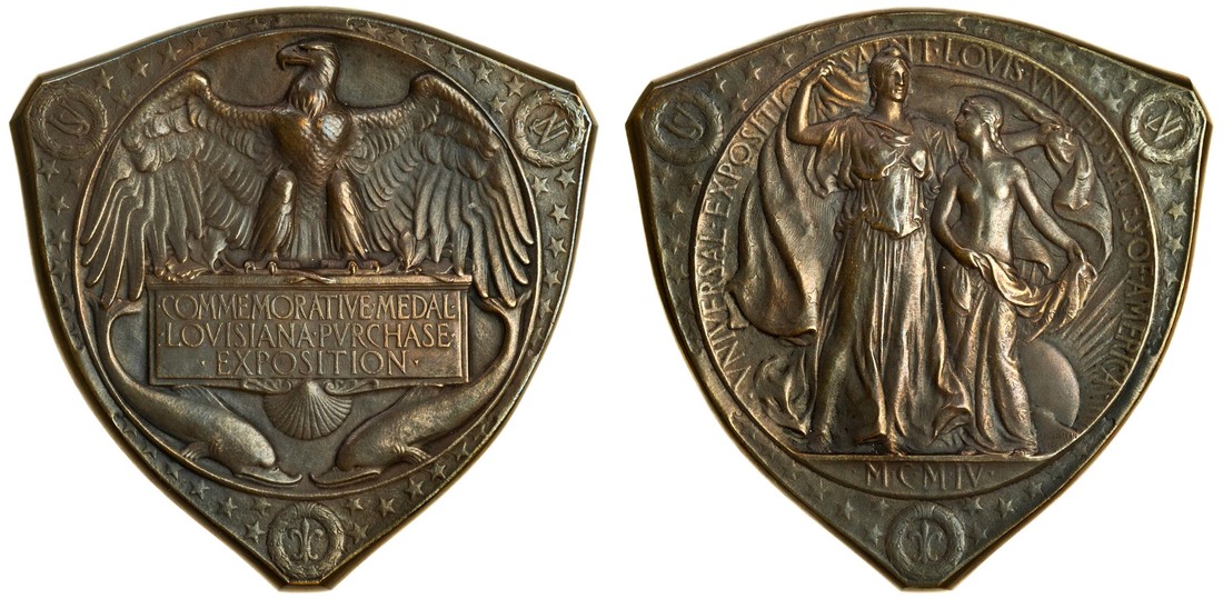 United States of America, Saint Louis Exposition 1904, bronze commemorative medal, by Adolph A Weinman, allegorical figures, rev. American eagle, 72mm. x 72mm., extremely fine, in case of issue with printed description