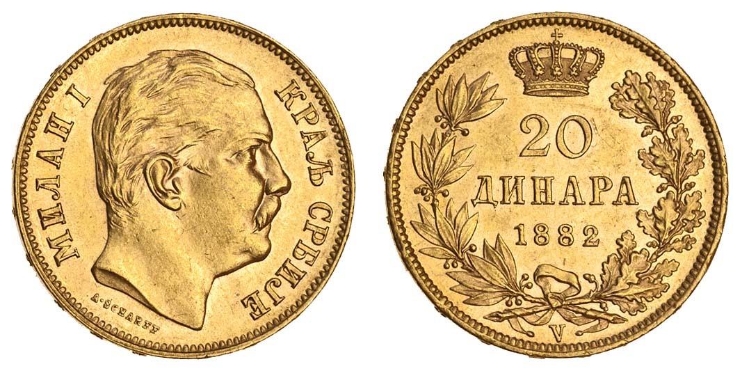(g) Yugoslavia, Milan Obrenovich (1868-82), 20-Dinara, 1882V, Vienna, bare head right, rev. crown above date and value (KM 17), good extremely fine