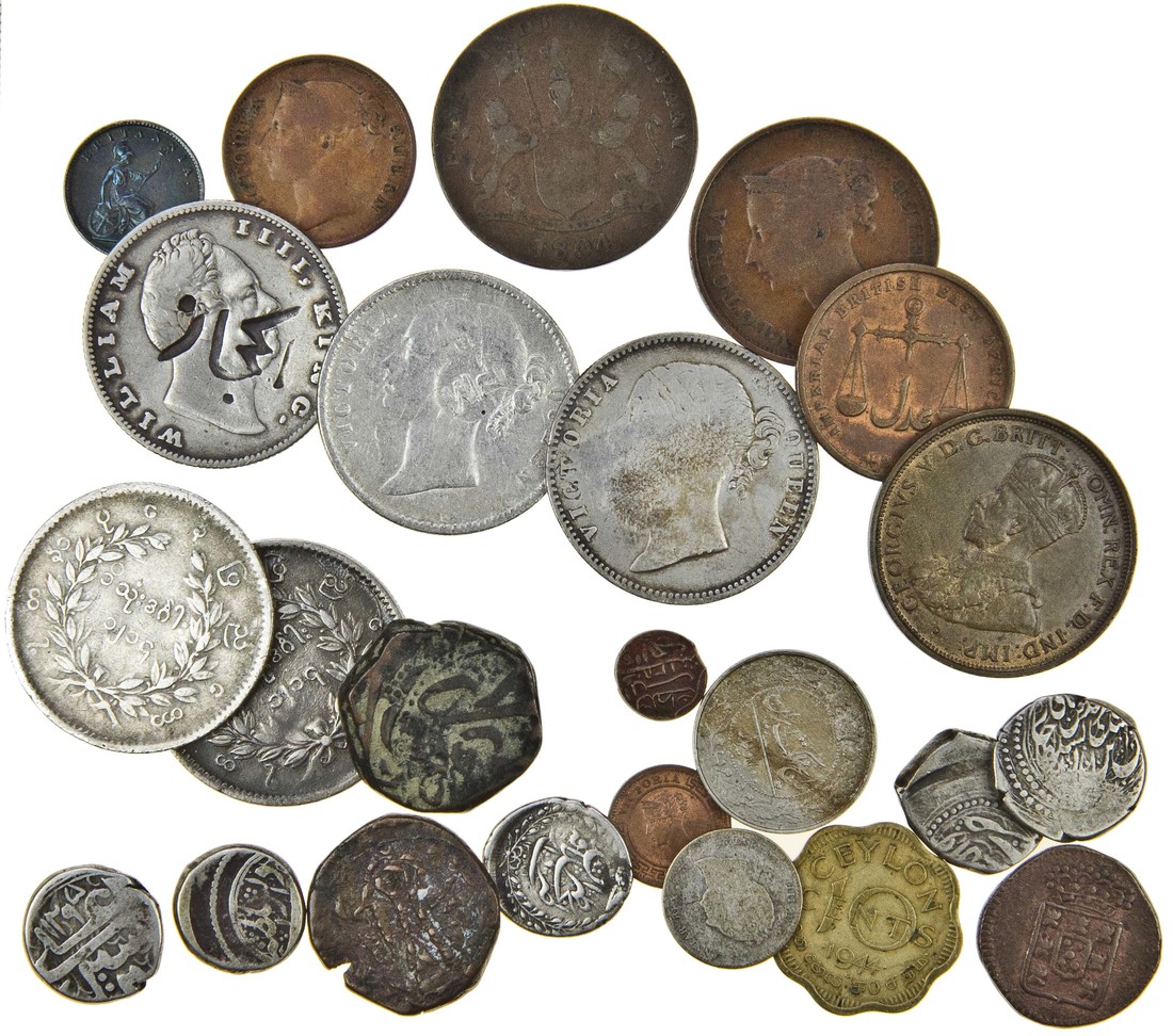 World, miscellaneous, Coins (24), including Ionian Islands, AE Lepton, 1853, Australia, AE Penny, 1913, Mombasa, AE Pice, 1888 / AH1306, Burma, peacock Kyat, CS1214 (2), these generally very fine to extremely fine, countermarked Rupee of William IV, 1835, 'Hejaz', countermarked Rupees of Victoria, 1840 (2), 'Nejd' and 'PM' for Mozambique, Goa, Maria II, 12-Reis, these very fine, other Coins of Demerary & Essequibo, Persia (8), Sri Lanka (2), Straits Settlements (2), Sumatra (1), Maldives (1), average condition fine, some better (24)