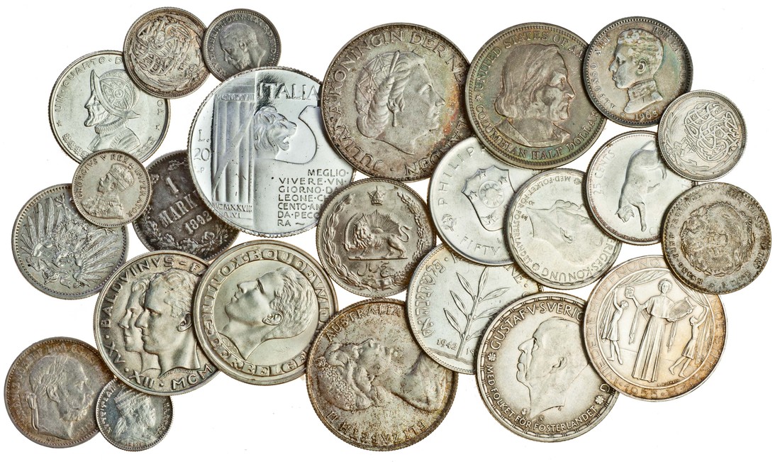 Miscellaneous silver coins (23), including Belgium, 50-Francs (2), 1958 and 1960, Ethiopia, Gersh, EE1895, Finland, Markka, 1892, Palestine, 100-Mils, 1942, Sweden, 2-Krona, 1947, Krona, 1950, and a fantasy 20-Lira of Mussolini dated 1928, very fine or better (24)