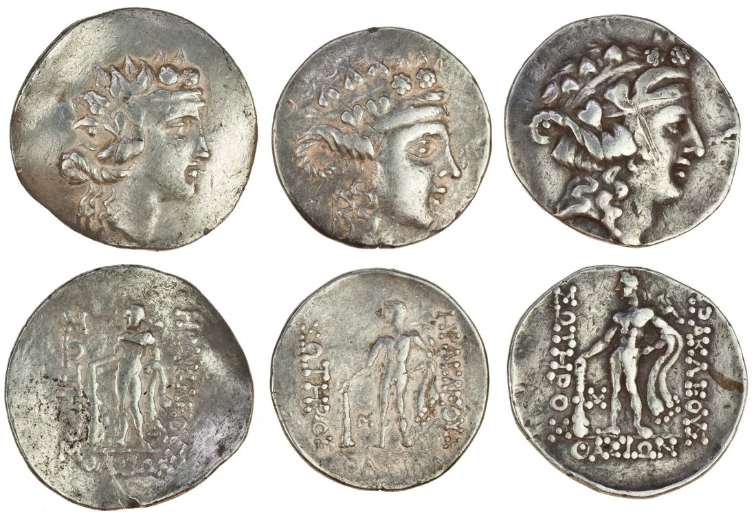 Thracian Islands, Thasos (after c.146 BC), AR Tetradrachms (3), 16.60g, 16.03g, 16.60g, head of young Dionysos right, wreathed with ivy, rev. young Herakles standing left, holding club and lion's skin, m on left (cf. Hellenistic Greek Coins 359), one appreciably bent, another with scratch on cheek, about very fine (3)