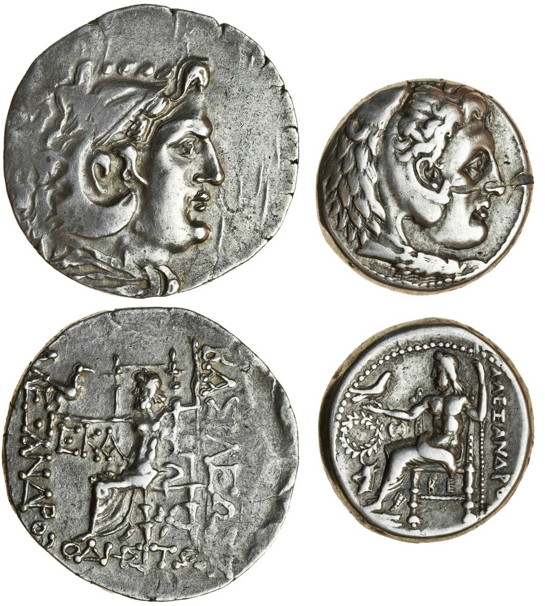 Kingdom of Macedon, Alexander III, the Great (336-323 BC), AR Tetradrachm, 16.75g, Susa, head of young Herakles right, wearing lion's skin, rev. Zeus enthroned left, holding eagle and sceptre, wreath, Boeotian shield and horned horse's head on left, be under throne (Price 3865), cut on face and edge, very fine, and a posthumous AR Tetradrachm, 16.20g, of Odessos (c.90-80 BC), same types, but on reverse ek-a on left, star below throne and ohitn (Price 1197), very fine (2)