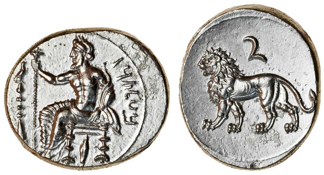 Cilicia, Tarsos, Mazaios, Satrap of Cilicia (c.361-334 BC), AR Stater, 10.74g, Baaltars seated left, holding lotus-tipped sceptre, eagle atop thymiaterion on left, Aramaic "b'ltrz behind, rev. lion walking left, Phoenician (?) z above (SNG Switzerland (Levante) Supplement 28 = this coin), extremely fine