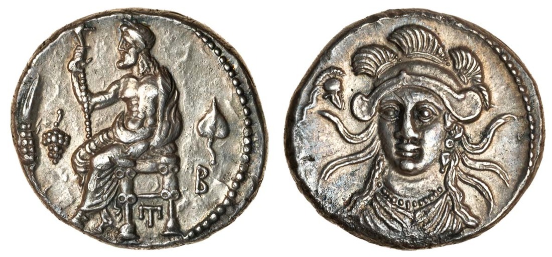 Cilicia, Tarsos, Balakros, Satrap of Cilicia (c.333-323 BC), AR Stater, 10.56g, Baaltars seated left, holding lotus-tipped sceptre, ear of grain and bunch of grapes on left, monogram below throne, b and leaf on right, rev. draped bust of Athena three-quarters facing to left, wearing triple-crested helmet, crested helmet on left (SNG Switzerland 121), toned, extremely fine