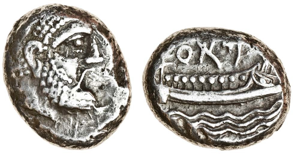 Phoenicia, Arados, uncertain king (c.348-338 BC), AR Stater, 10.44g, laureate head of Baal right, rev. galley over stylised waves, Aramaic above (Betlyon 26), almost very fine