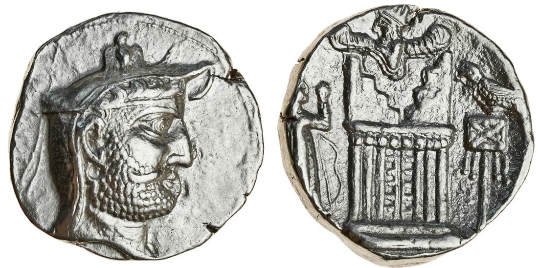 Kingdom of Persis, Autophradates II (early- mid 2nd cent. BC), AR Tetradrachm, 16.37g, diademed head right, wearing kyrbasia with eagle on top, rev. fire-temple with Ahura-Mazda hovering above, between the king and a bow on left, and an eagle perched on standard on right ( Klose and Mueseler 3/1 var. ; Alram 546 var.; BMC 1 var.), the addition of a bow beside Autophradates on the reverse appears to be unrecorded, the king's head on the obverse in high relief, extremely fine and very rare, very few examples known and this possibly the finest portrait