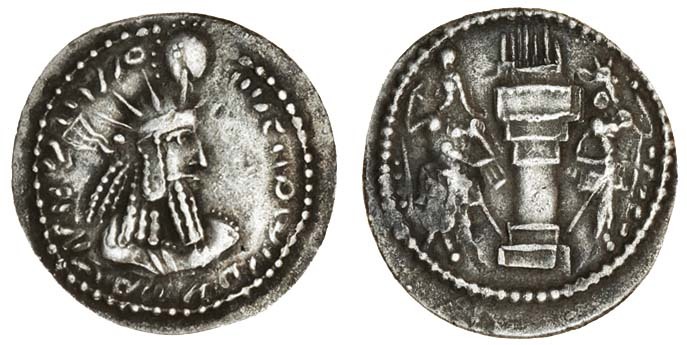 Sasanian Empire, Varhran I (AD 273-276), AR Obol, .65g, diademed and draped bust right, wearing radiate crown, rev. fire-altar between two regal attendants facing outwards (SNS p.460, 58), toned, good metal, good very fine and rare