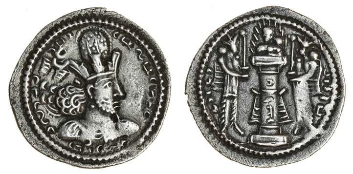 Sasanian Empire, Shapur II (AD 309-379), AR Obol, .72g, diademed and draped bust right, wearing turreted crown surmounted by korymbos, rev. fire-altar with bust in flames, between two regal attendants facing it (SNS p.44, 102), toned, good metal, good very fine, scarce