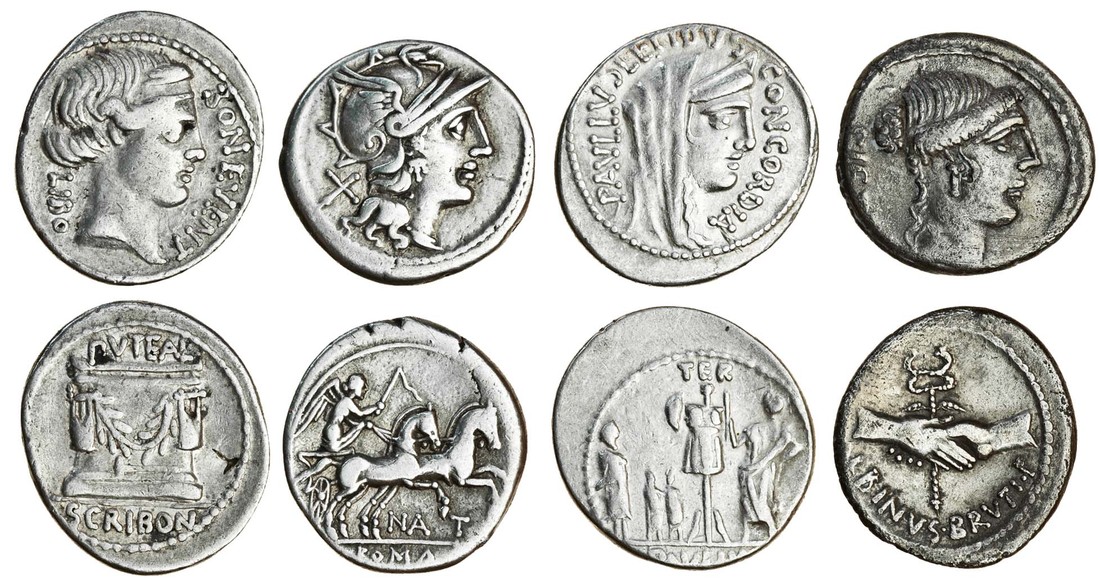 Roman Republic, AR Denarii, comprising Pinarius Natta (149 BC), Roma head right, rev. Victory in biga right (RRC 200/1), L.Scribonius Libo (62 BC), head of Bonus Eventus right, rev. well-head with hammer at base (RRC 416/1a), L.Aemilius Lepidus Paullus, (62 BC), veiled head of Concordia right, rev. L. Aemilius Paullus standing left before trophy, to left of which are king Perseus and his sons (RRC 415/1), and D. Iunius Brutus Albinus (48 BC), head of Pietas right, rev. clasped right hands holding winged caduceus (RRC 450/2), almost very fine (4)