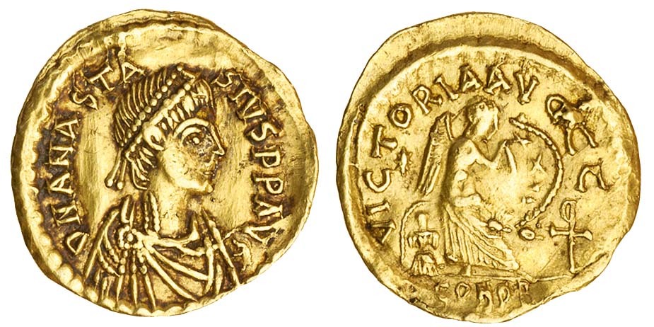 Anastasius (AD 491-518), AV Semissis, 2.19g, Constantinople, diademed, draped and cuirassed bust right, rev. Victoria avggg, Victory seated right on shield and cuirass, inscribing xxxx on shield, star behind, inverted Christogram on right (Sear 6; DOC 8), slightly wavy flan, very fine