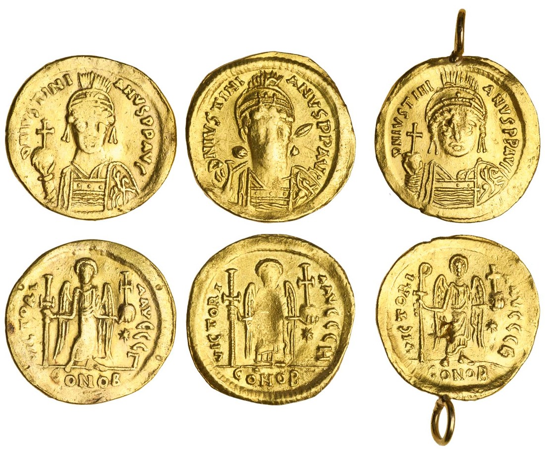 Justinian I (AD 527-565), AV Solidus, 4.23g, Constantinople, helmeted and cuirassed bust facing three-quarters right, holding spear over shoulder, and shield, rev. victori-a avgggh, angel standing facing, holding long cross and cross on globe, star on right, conob in exergue (Sear 137; DOC 3-5), good fine, another, 4.34g, as last, but bust facing and holding cross on globe, the reverse officinal (Sear 138; DOC 7), good fine, and another, 4.66g, similar, but angel holds staff surmounted by Christogram, officina e (Sear 140; DOC 9), loop mount affixed, very fine (3)