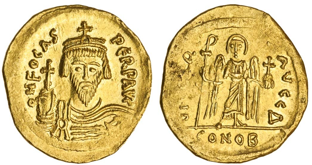 Focas (AD 602-610), AV Solidus, 4.31g, Constantinople, crowned, draped and cuirassed facing, holding cross on globe, rev. victori a avgg, angel standing facing, holding staff surmounted by Christogarm and cross on globe, conob in exergue (Sear 618; DOC 5), extremely fine